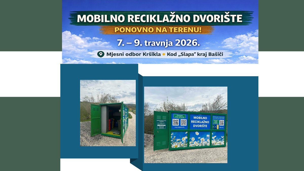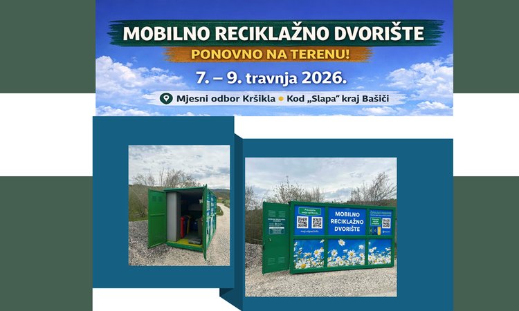 U razdoblju od 7. do 9. travnja 2026., mobilno reciklažno dvorište bit će postavljeno na području Mjesnog odbora Kršikla, na lokaciji kod „Slapa“, u blizini mjesta Bašići.